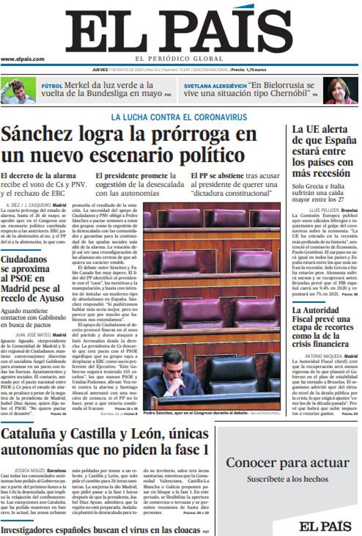 EL PAÍS: "Sánchez logra la prórroga en un nuevo escenario político"; "Ciudadanos se aproxima al PSOE en Madrid pese al recelo de Ayuso"; "Cataluña y Castilla y León, únicas autonomías que no piden la fase 1"; "Investigadores españoles buscan el virus en las cloacas"; "La UE alerta de que España estará entre los países con más recesión"; "La Autoridad Fiscal prevé una etapa de recortes como la de la crisis financiera".