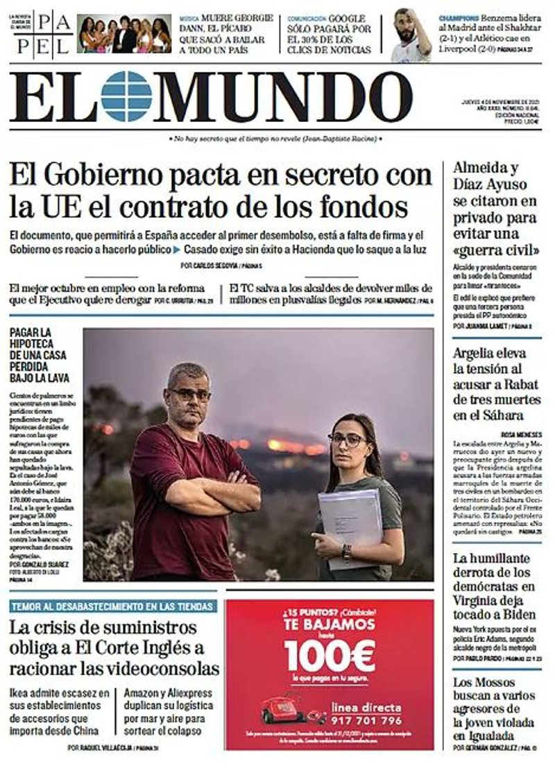 EL MUNDO: "El Gobierno pacta en secreto con la UE el contrato de los fondos"; "La crisis de suministros obliga a El Corte Inglés a racionar las videoconsolas"; "Almeida y Díaz Ayuso se citaron en privado para evitar una "guerra civil""; "Argelia eleva la tensión al acusar a Rabat de tres muertos en el Sáhara"; "La humillante derrota de los demócratas en Virginia deja tocado a Biden"; "Los Mossos buscan a varios agresores de la joven violada en Igualada".
