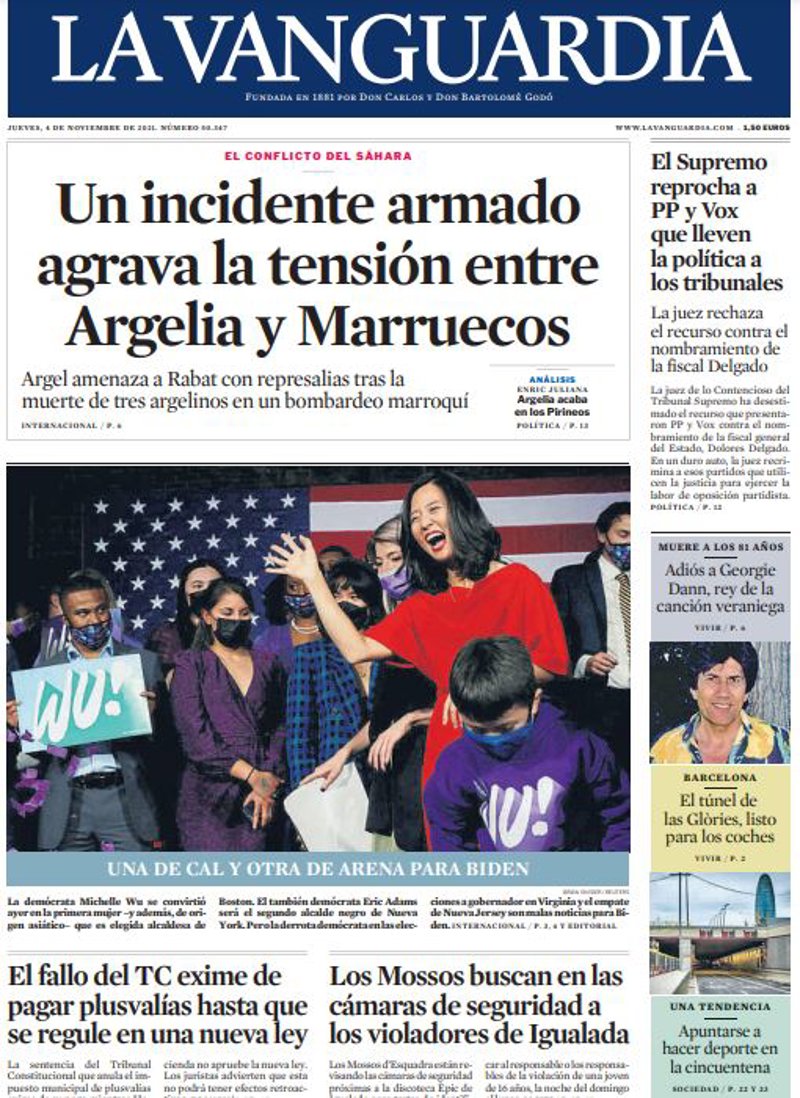 LA VANGUARDIA: "Un incidente armado agrava la tensión entre Argelia y Marruecos"; "El fallo del TC exime de pagar plusvalías hasta que se regule en una nueva ley"; "Los Mossos buscan en las cámaras de seguridad a los violadores de Igualada"; "El Supremo reprocha a PP y Vox que lleven la política a los tribunales".
