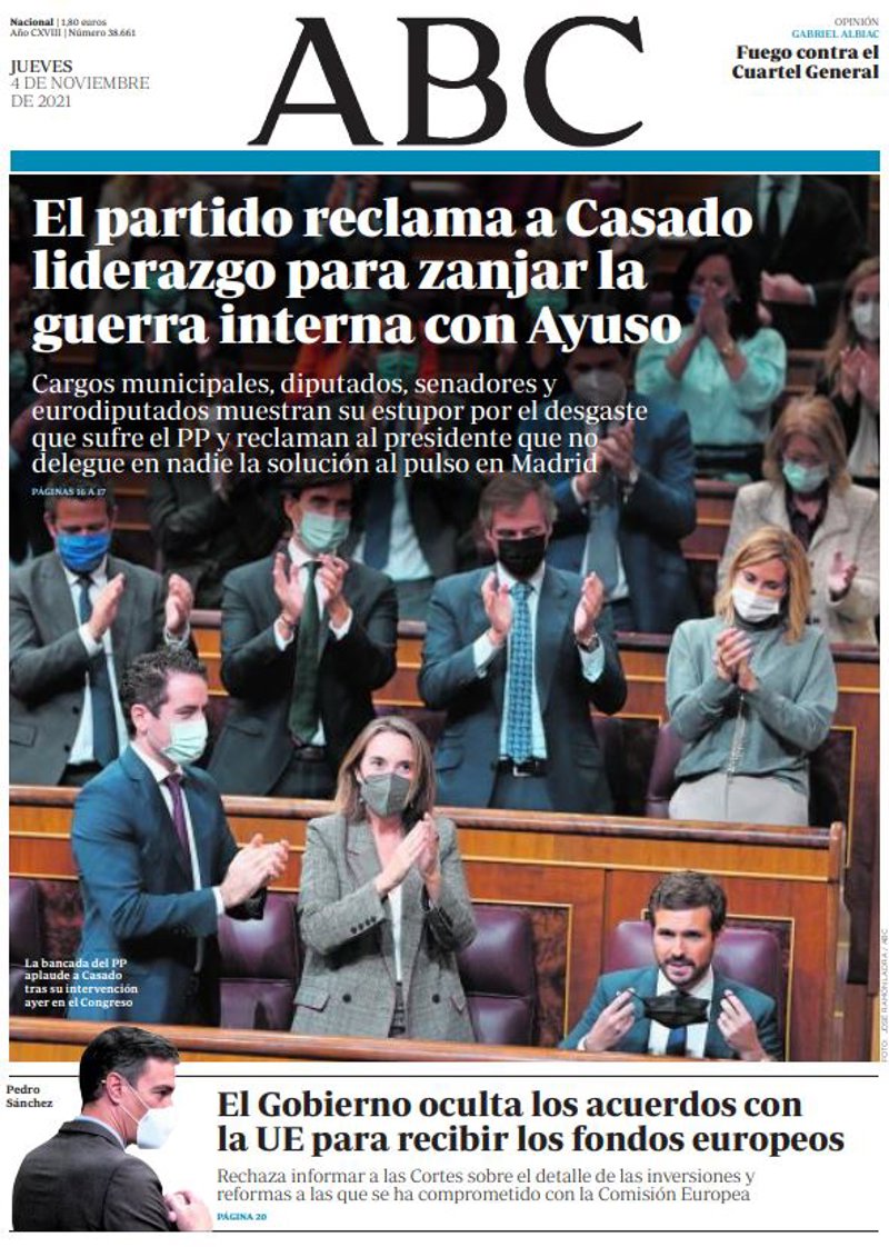 ABC: "El partido reclama a Casado liderazgo para zanjar la guerra interna con Ayuso. Cargos municipales, diputados, senadores y eurodiputados muestran su estupor por el desgaste que sufre el PP y reclaman al presidente que no delegue en nadie la solución al pulso en Madrid"; "El Gobierno oculta los acuerdos con la UE para recibir los fondos europeos. Rechaza informar a las Cortes sobre el detalle de las inversiones y reformas a las que se ha comprometido con la Comisión Europea".