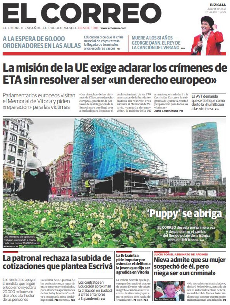 EL CORREO: "La misión de la UE exige aclarar los crímenes de ETA sin resolver al ser "un derecho europeo""; "La patronal rechaza la subida de cotizaciones que plantea Escrivá"; "La Ertzaintza pide imputar por "simular el delito" a la joven que dijo ser agredida en Vitoria"; "Nieva admite que su mujer sospechó de él, pero niega ser "un criminal"".