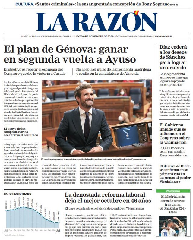 LA RAZÓN: "El plan de Génova: ganar en segunda vuelta a Ayuso"; "La denostada reforma laboral deja el mejor octubre en 46 años"; "Díaz cederá a los deseos de Sánchez para lograr un acuerdo"; "El Gobierno impide que se informe en el Congreso sobre la vacunación"; "El declive de Biden se confirma en su primera cita en las urnas al perder Virginia".