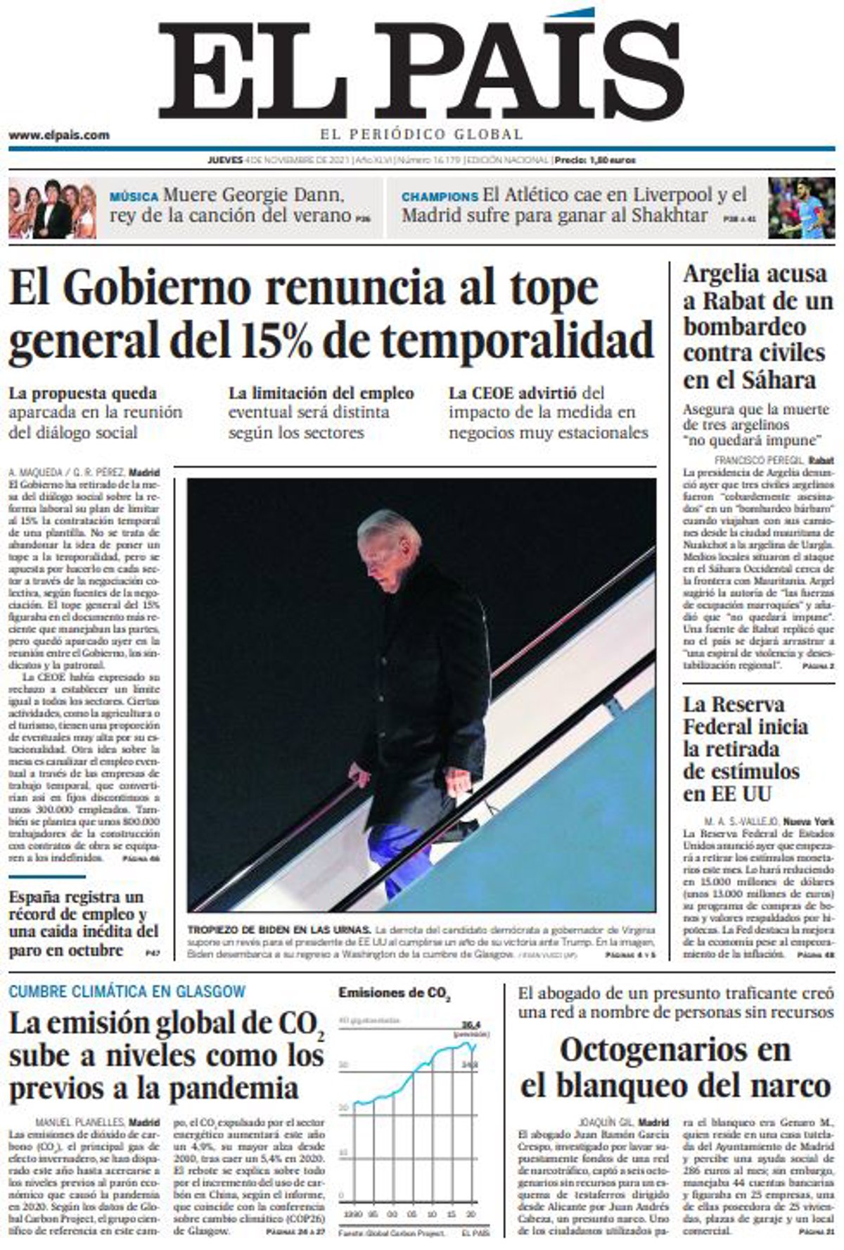 EL PAÍS: "El Gobierno renuncia al tope general del 15% de temporalidad"; "España registra un récord de empleo y una caída inédita del paro en octubre"; "La emisión global de CO2 sube a niveles como los previos a la pandemia"; "Argelia acusa a Rabat de un bombardeo contra civiles en el Sáhara"; "La Reserva Federal inicia la retirada de estímulos en EE UU"; "Octogenarios en el blanqueo del narco".