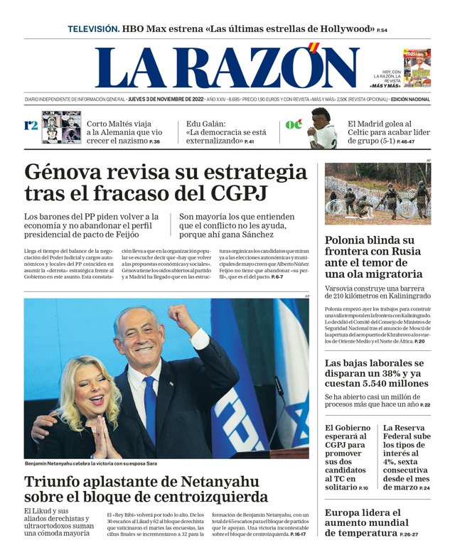 LA RAZÓN: "Génova revisa su estrategia tras el fracaso del CGPJ"; "Polonia blinda su frontera con Rusia ante el temor de una ola migratoria"; "Las bajas laborales se disparan un 38% y ya cuestan 5.540 millones"; "Triunfo aplastante de Netanyahu sobre el bloque de centroizquierda"; "El Gobierno esperará al CGPJ para promover sus dos