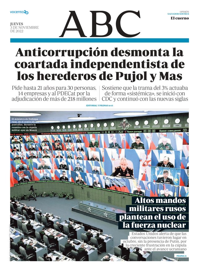 ABC: "Anticorrupción desmonta la coartada independentista de los herederos de Pujol y Mas"; "Altos mandos militares rusos plantean el uso de la fuerza nuclear".