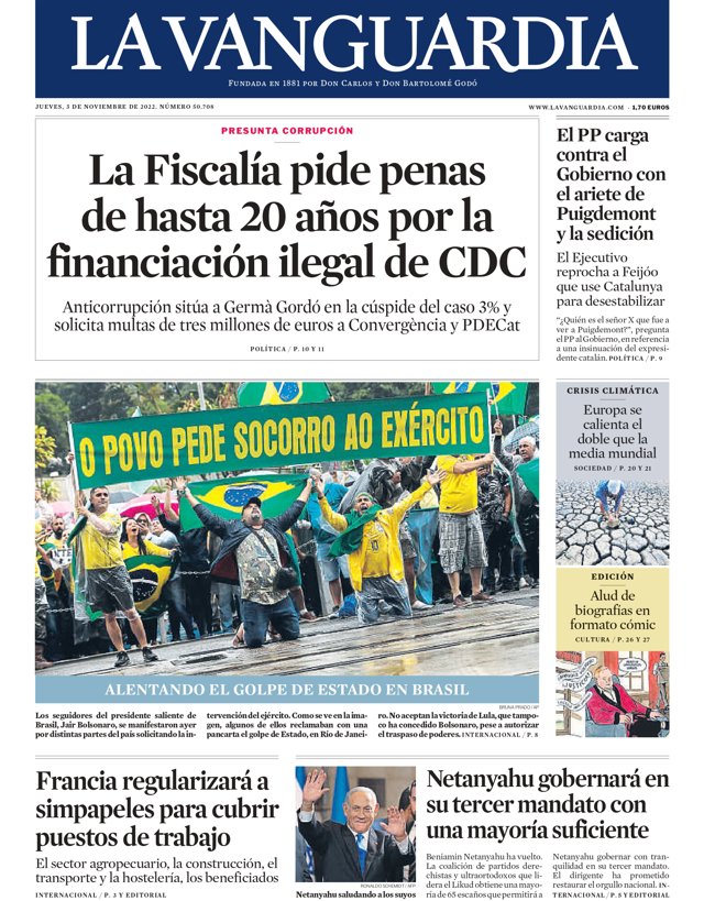 financiación ilegal de CDC"; "El PP carga contra el Gobierno con el ariete de Puigdemont y la sedición"; "Alentando el golpe de Estado en Brasil"; "Francia regularizará a simpapeles para cubrir puestos de trabajo"; "Netanyahu gobernará en su tercer mandato con una mayoría suficiente".