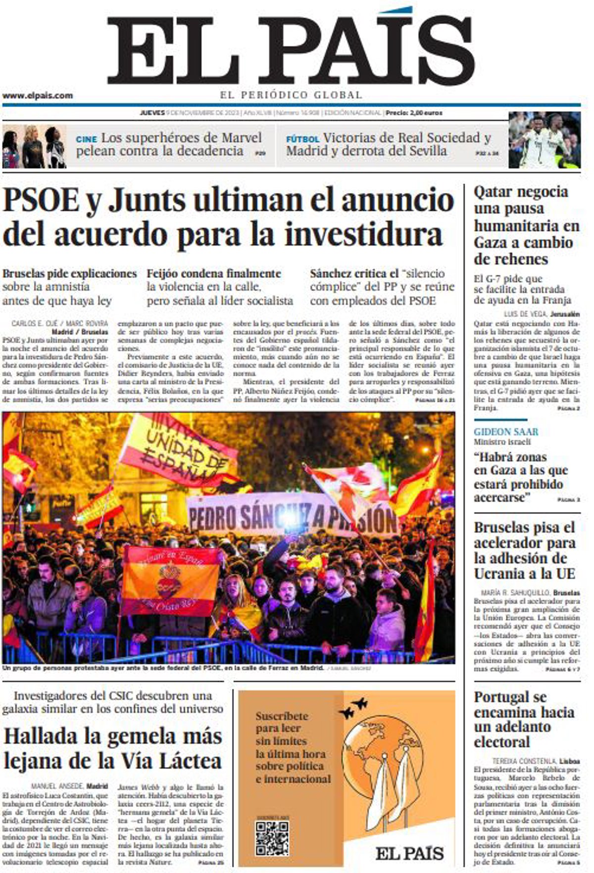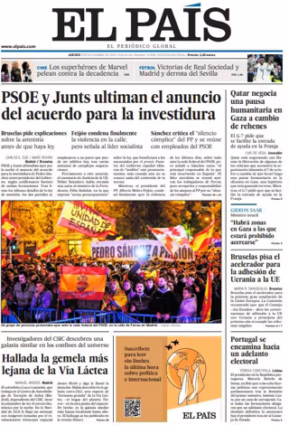 EL PAÍS: "PSOE y Junts ultiman el anuncio del acuerdo para la investidura"; "Hallada la gemela más lejana de la Vía Láctea"; "Qatar negocia una pausa humanitaria en Gaza a cambio de rehenes"; "Bruselas pisa el acelerador para la adhesión de Ucrania a la UE"; "Portugal se encamina hacia un adelanto electoral".