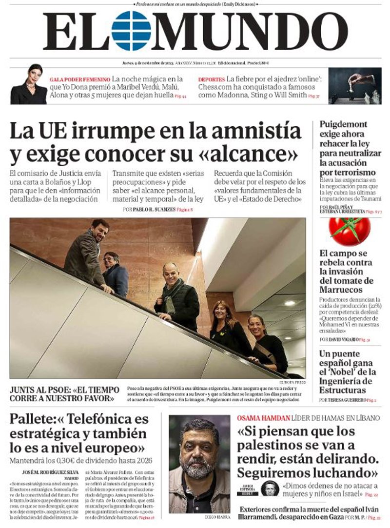 EL MUNDO: "La UE irrumpe en la amnistía y exige conocer su "alcance""; "Pallete: "Telefónica es estratégica y también lo es a nivel europeo""; "Puigdemont exige ahora rehacer la ley para neutralizar la acusación por terrorismo"; "El campo se rebela contra la invasión del tomate de Marruecos"; "Un puente español gana el 'Nobel' de la Ingeniería de Estructuras".