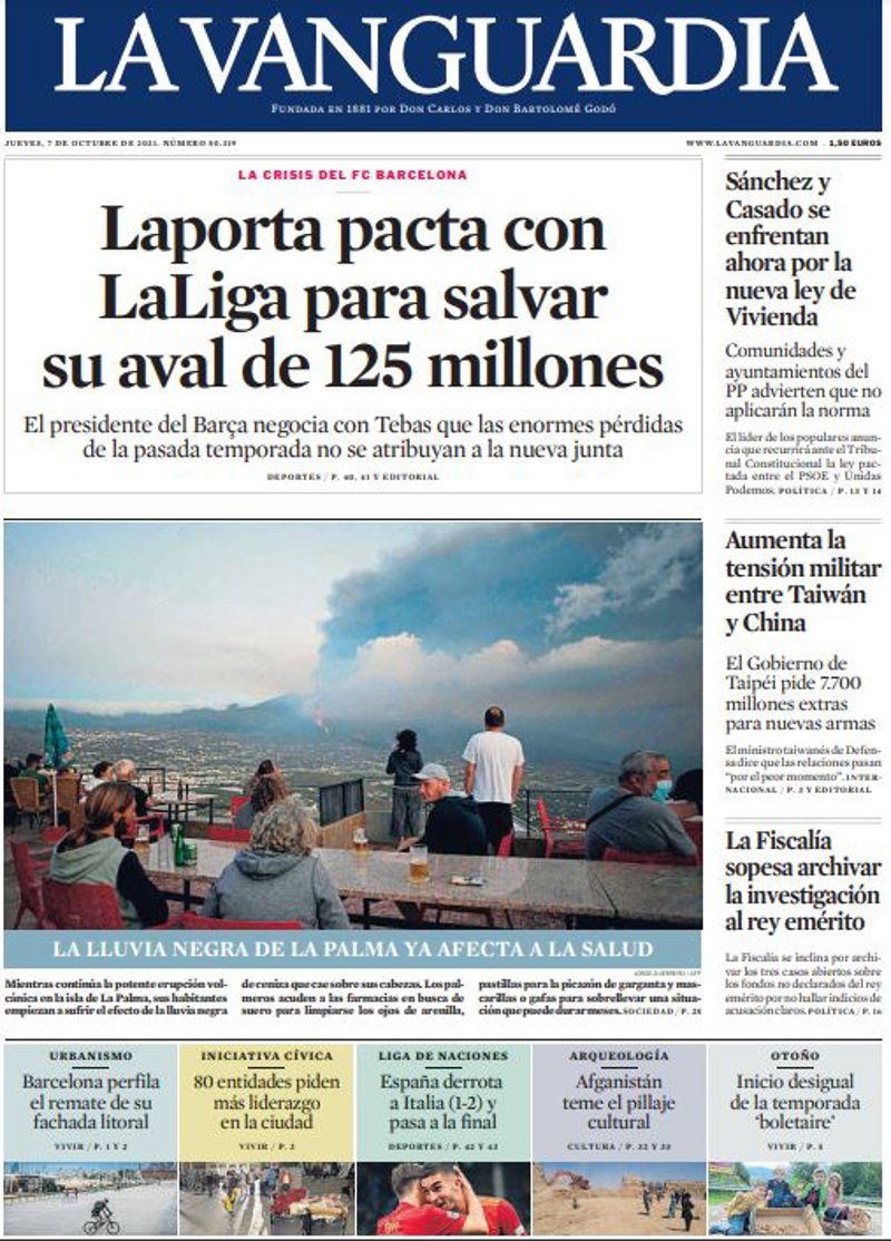LA VANGUARDIA: "Laporta pacta con La Liga para salvar su aval de 125 millones"; "Sánchez y Casado se enfrentan ahora por la nueva ley de Vivienda"; "Aumenta la tensión militar entre Taiwán y China"; "La Fiscalía sopesa archivar la investigación al rey emérito".
