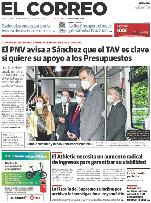 EL CORREO: "El PNV avisa a Sánchez que el TAV es clave si quiere su apoyo a los Presupuestos"; "El Athletic necesita un aumento radical de ingresos para garantizar su viabilidad"; "La Fiscalía del Supremo se inclina por archivar la investigación al rey emérito"; "Los jóvenes recibirán un bono cultural de 400 euros cuando cumplan 18 años".