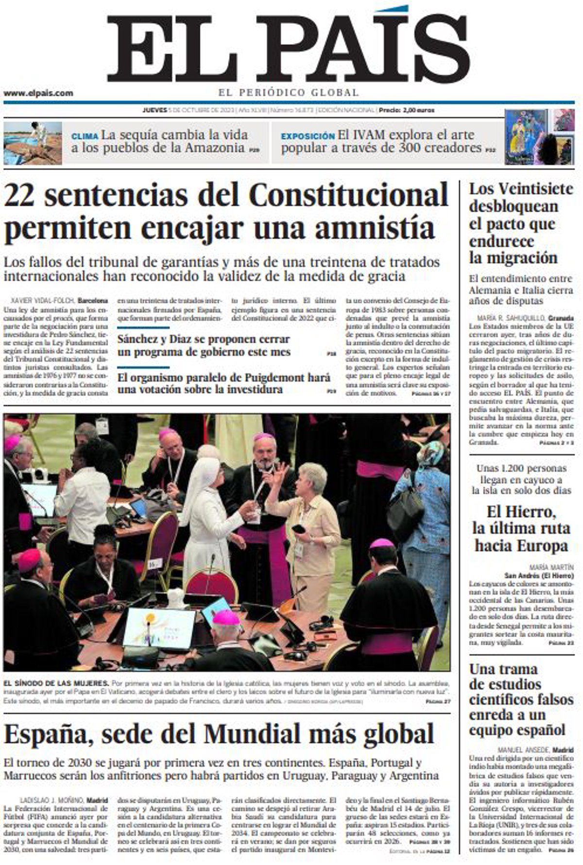 EL PAÍS: "22 sentencias del Constitucional permiten encajar una amnistía"; "España, sede del Mundial más global"; "Los Veintisiete desbloquean el pacto que endurece la migración"; "El Hierro, la última ruta hacia Europa"; "Una trama de estudios científicos falsos enreda a un equipo español".