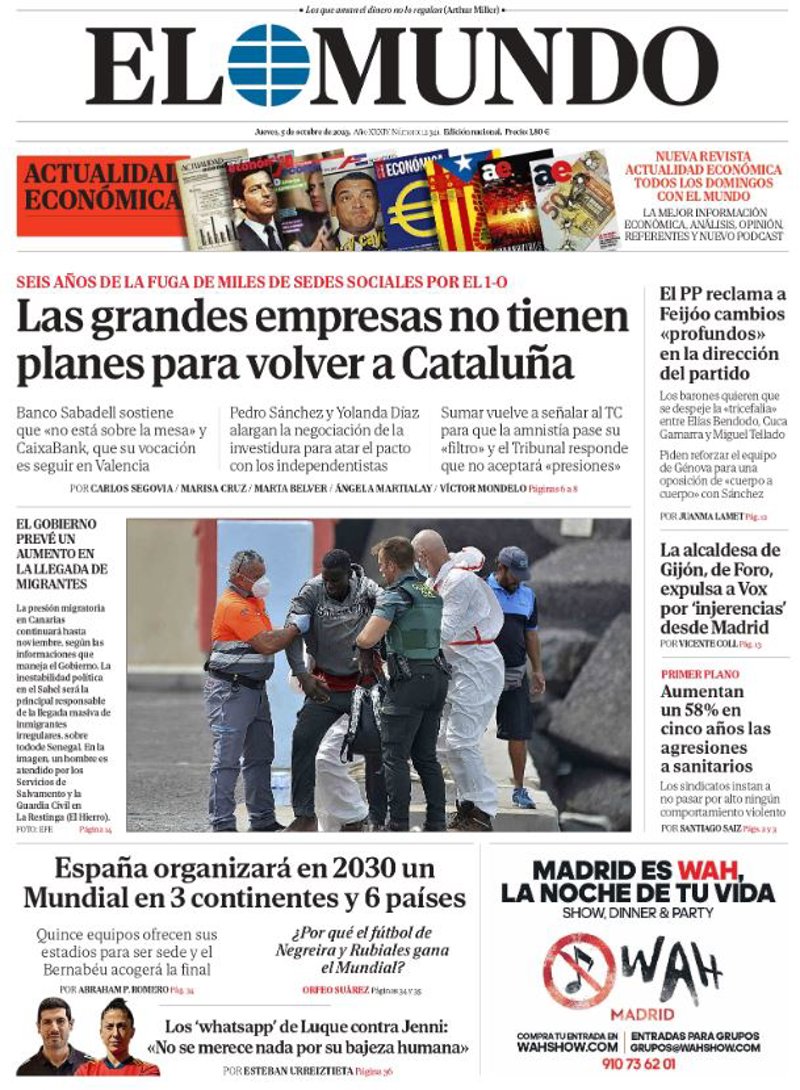 EL MUNDO: "Las grandes empresas no tienen para volver a Cataluña"; "España organizará en 2030 un Mundial en 3 continentes y 6 países"; "El PP reclama a Feijóo cambios "profundos" en la dirección del partido"; "La alcaldesa de Gijón, de Foro, expulsa a Vox por 'injerencias' desde Madrid"; "Aumentan un 58% en cinco años las agresiones a sanitarios".