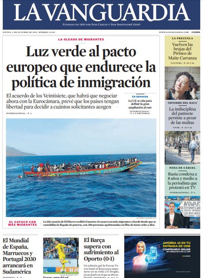 LA VANGUARDIA: "Luz verde al pacto europeo que endurece la política de inmigración"; "El Mundial de España, Marruecos y Portugal 2030 arrancará en Sudamérica"; "El Barça supera con sufrimiento al Oporto (0-1)".