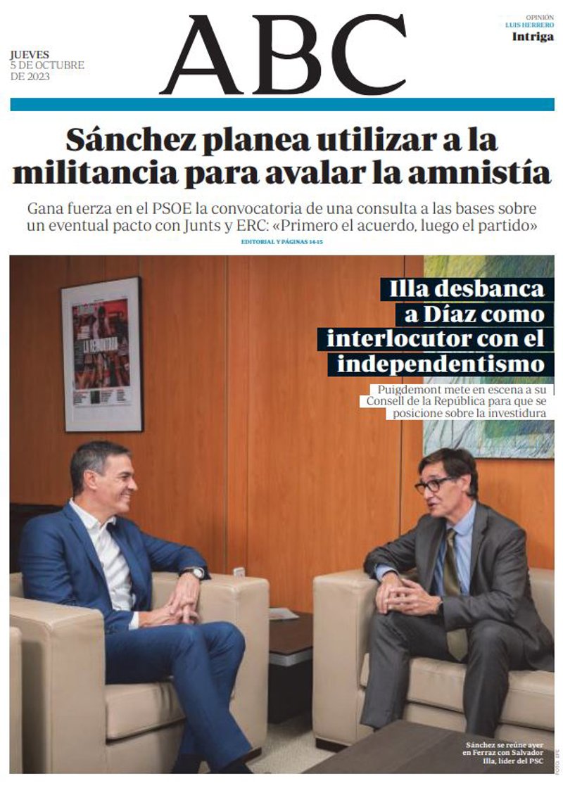ABC: "Sánchez planea utilizar a la militancia para avalar la amnistía. Gana fuerza en el PSOE la convocatoria de una consulta a las bases sobre un eventual pacto con Junts y ERC: "Primero el acuerdo, luego el partido""; "Illa desbanca a Díaz como interlocutor con el independentismo. Puigdemont mete en escena a su Consell de la República para que se posicione sobre la investidura".