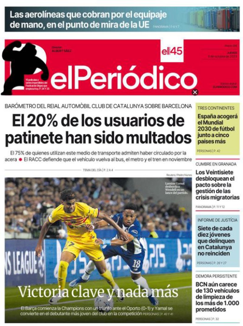 EL PERIÓDICO: "El 20% de los usuarios de patinete han sido multados"; "Victoria clave y nada más"; "España acogerá el Mundial 2030 de fútbol junto a cinco países más"; "Los Veintisiete desbloquean el pacto sobre la gestión de las crisis migratorias"; "BCN aún carece de 130 vehículos de limpieza de los más de 1.000 prometidos".