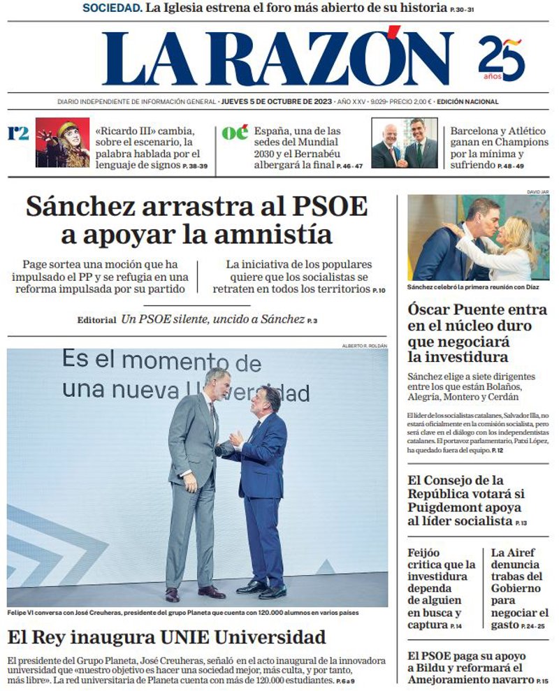 LA RAZÓN: "Sánchez arrastra al PSOE a apoyar la amnistía"; "El Rey inaugura UNIE Universidad"; "Óscar Puente entra en el núcleo duro que negociará la investidura"; "El Consejo de la República votará si Puigdemont apoya al líder socialista"; "Feijóo critica que la investidura dependa de alguien en busca y captura"; "La Airef denuncia trabas del Gobierno para negociar el gasto"; "El PSOE paga su apoyo a Bildu y reformará el Amejoramiento navarro".