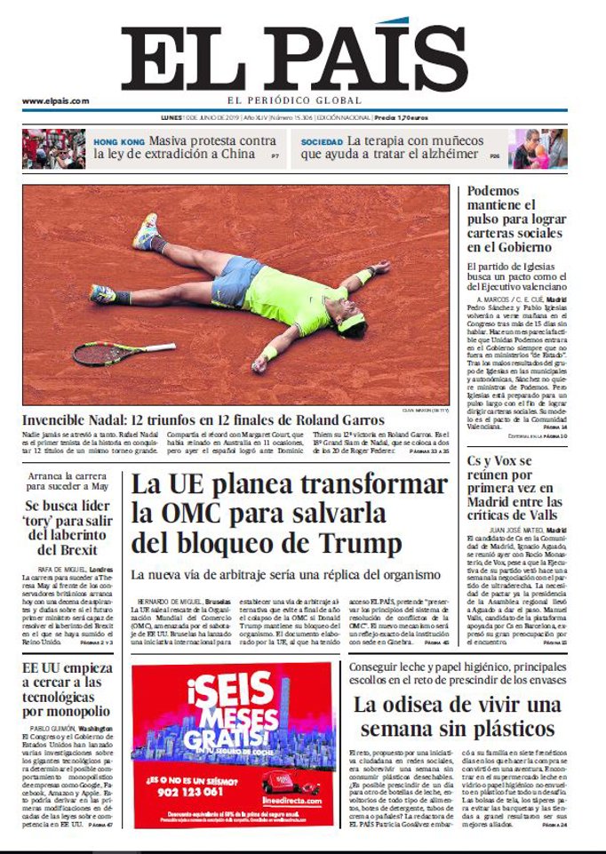 EL PAÍS: "Invencible Nadal: 12 triunfos en 12 finales de Roland Garros"; "La UE planea transformar la OMC para salvarla del bloqueo de Trump"; "La odisea de vivir una semana sin plásticos"; "Se busca líder 'tory' para salir del laberinto del Brexit"; "EE UU empieza a cercar a las tecnológicas por monopolio"; "Podemos mantiene el pulso para lograr carteras sociales en el Gobierno".