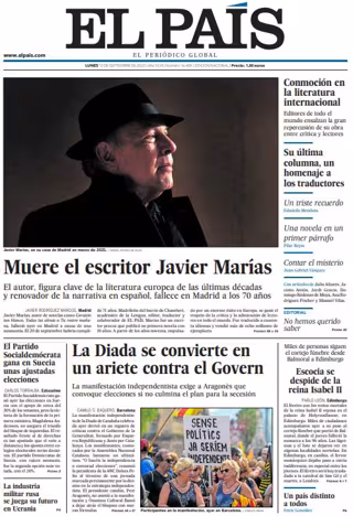 EL PAÍS: "Muere el escritor Javier Marías"; "La Diada se convierte en un ariete contra el Govern"; "El Partido Socialdemócrata gana en Suecia unas ajustadas elecciones"; "La industria militar rusa se juega su futuro en Ucrania"; "Escocia se despide de la reina Isabel II".