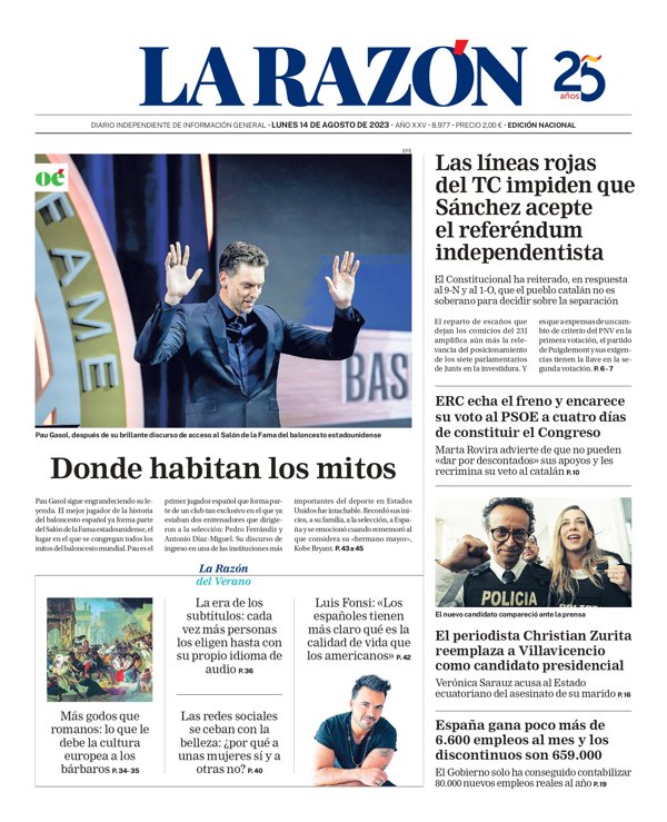 LA RAZÓN: "Las líneas rojas del TC impiden que Sánchez acepte el referéndum independentista"; "ERC echa el freno y encarece su voto al PSOE a cuatro días de constituir el Congreso"; "El periodista Christian Zurita reemplaza a Villavicencio como candidato presidencial"; "España gana poco más de 6.600 empleos al mes y los discontinuos son 659.000".