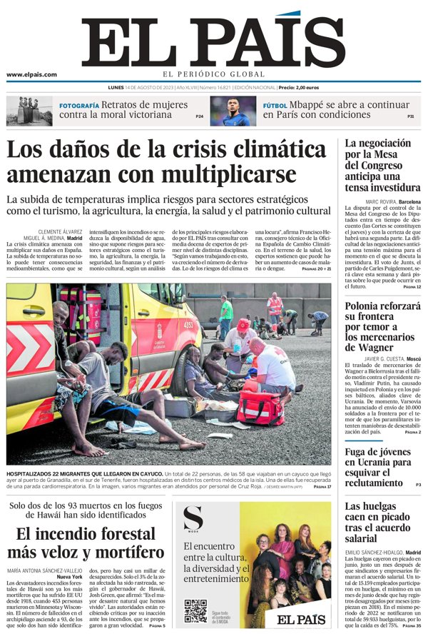 EL PAÍS: "Los daños de la crisis climática amenazan con multiplicarse"; "La negociación por la Mesa del Congreso anticipa una tensa investidura"; "Polonia reforzará su frontera por temor a los mercenarios de Wagner"; "Fuga de jóvenes en Ucrania para esquivar el reclutamiento"; "Las huelgas caen en picado tras el acuerdo salarial"; "El incendio forestal más veloz y mortífero".