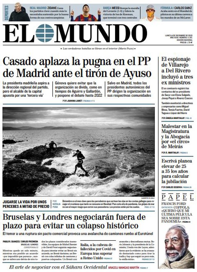 EL MUNDO: "Casado aplaza la pugna en el PP de Madrid ante el tirón de Ayuso"; "Bruselas y Londres negociarán fuera de plazo para evitar un colapso histórico"; "El espionaje de Villarejo a Del Rivero incluyó a tres ex ministros"; "Malestar en la Magistratura y la Abogacía por "el circo" de Meirás"; "Escrivá planea elevar de 25 a 35 los años para calcular la jubilación".
