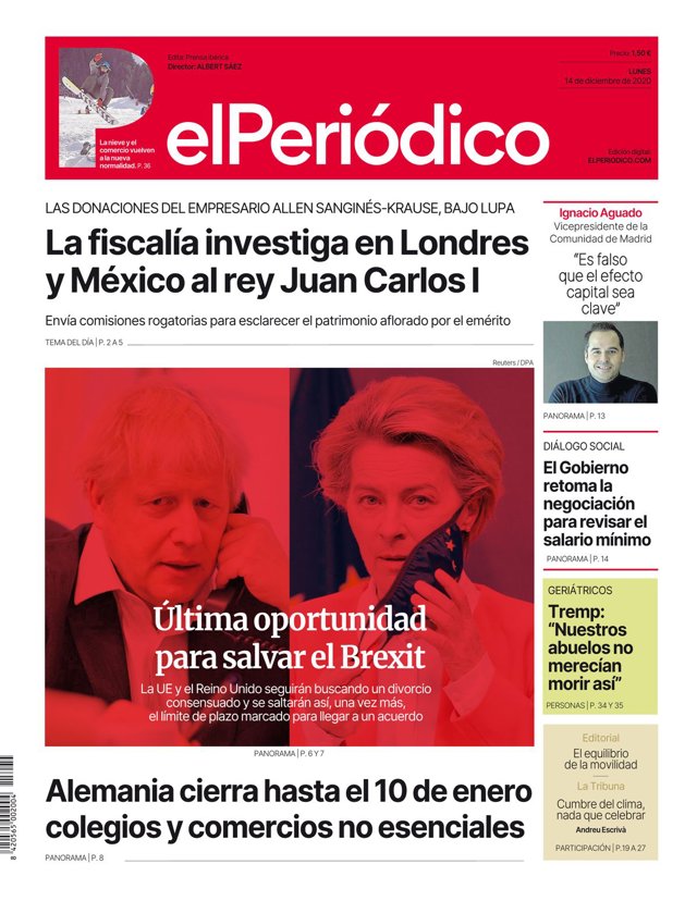 EL PERIÓDICO: "La Fiscalía investiga en Londres y México al rey Juan Carlos I"; "Última oportunidad para salvar el Brexit"; "Alemania cierra hasta el 10 de enero colegios y comercios no esenciales"; "Ignacio Aguado, vicepresidente de la Comunidad de Madrid: "Es falso que el efecto capital sea clave""; "El Gobierno retoma la negociación para revisar el salario mínimo"; "Tremp: "Nuestros abuelos no merecían morir así"".