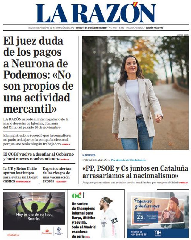 LA RAZÓN: "El juez duda de los pagos a Neurona de Podemos: "No son propios de una actividad mercantil""; "El CGPJ vuelve a desafi ar al Gobierno y hará nuevos nombramientos"; "La UE y Reino Unido apuran los tiempos para evitar un Brexit caótico"; "Expertos alertan de los riesgos de una vacunación exprés"; "Inés Arrimadas; ""PP, PSOE y Cs juntos en Cataluña arrasaríamos al nacionalismo"".