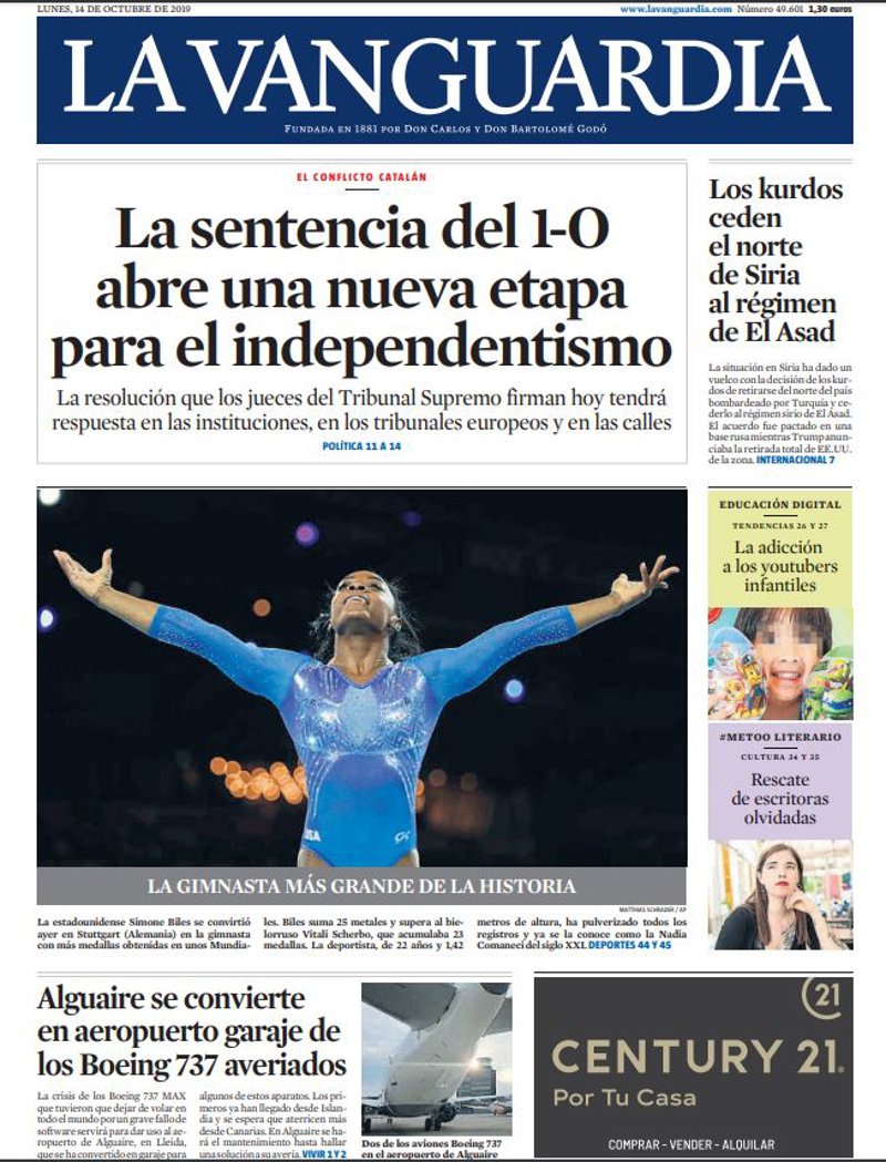 LA VANGUARDIA: "La sentencia del 1-O abre una nueva etapa para el independentismo"; "Los kurdos ceden el norte de Siria al régimen de El Asad"; "Alguaire se convierte en aeropuerto garaje de los 737 averiados "; "La gimnasta más grande de la historia"; "La adicción a los youtubers infantiles".