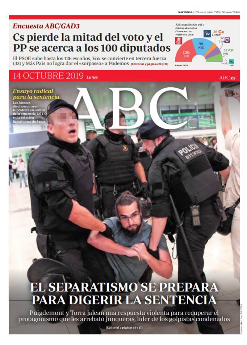 ABC: "Cs pierde la mitad del voto y el PP se acerca a los 100 diputados"; "El separatismo se prepara para digerir la sentencia"; "Puigdemont y Torra jalean una respuesta violenta para recuperar el protagonismo que les arrebató Junqueras, líder de los golpistas condenados".