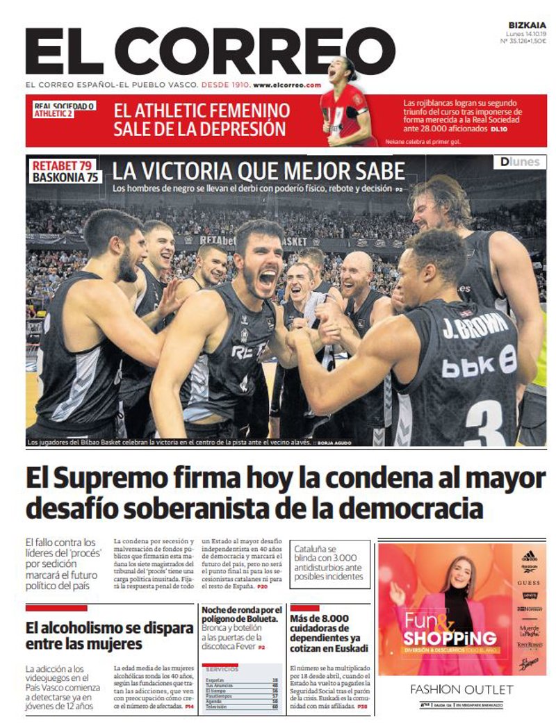 EL CORREO: "El Supremo firma hoy la condena al mayor desafío soberanista de la democracia"; "El alcoholismo se dispara entre las mujeres"; "La victoria que mejor sabe"; "El Athletic femenino sale de la depresión"; "Más de 8.000 cuidadoras de dependientes ya cotizan en Euskadi"; "Noche de ronda por el