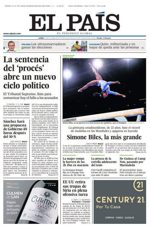 EL PAÍS: "La sentencia el 'procés' abre un nuevo ciclo político"; "Sánchez hará una propuesta de Gobierno 48 horas después del 10-N"; "Simone Biles, la más grande"; "La mujer rompe la barrera de las 2h 15m en maratón"; "EE UU retira sus tropas de Siria en plena ofensiva turca"; "Quito, militarizada y en toque de queda ante las protestas".