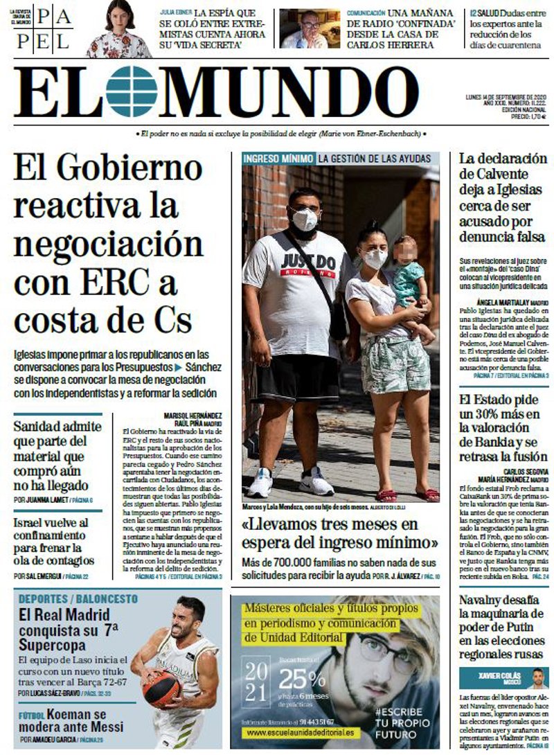 EL MUNDO: "El Gobierno reactiva la negociación con ERC a costa de Cs"; "Sanidad admite que parte del material que compró aún no ha llegado"; "Israel vuelve al confinamiento para frenar la ola de contagios"; ""Llevamos tres meses en espera del ingreso mínimo""; "La declaración de Calvente deja a Iglesias cerca de ser acusado por denuncia falsa"; "El Estado pide un 30% más en la valoración de Bankia y se retrasa la fusión"; "Navalny desafía la maquinaria de poder de Putin en las elecciones regionales rusas".