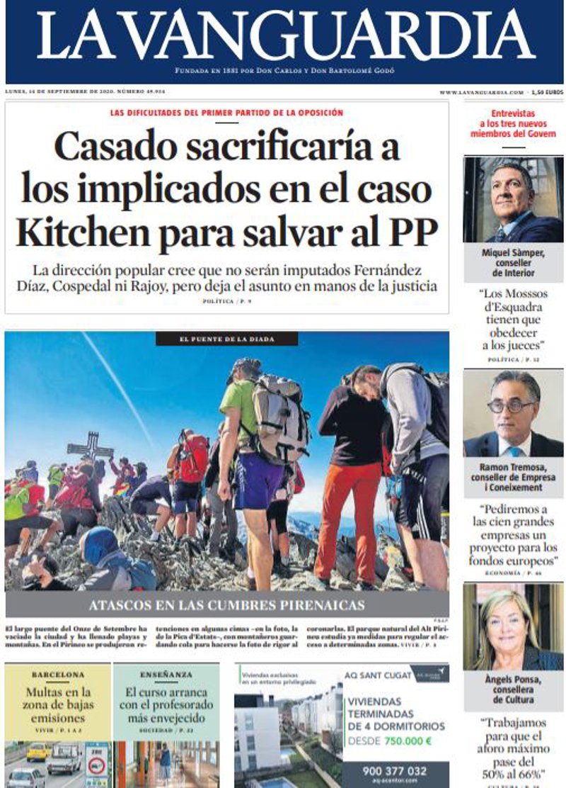 LA VANGUARDIA: "Casado sacrificaría a los implicados en el caso Kitchen para salvar al PP"; "Entrevistas a los tres nuevos miembros del Govern. Miquel Sàmper, conseller de Interior: "Los Mosssos d'Esquadra tienen que obedecer a los jueces". Ramon Tremosa, conseller de Empresa i Coneixement: "Pediremos a las cien grandes empresas un proyecto para los fondos europeos". Àngels Ponsa, consellera de Cultura: "Trabajamos para que el aforo máximo pase del 50% al 66%"".