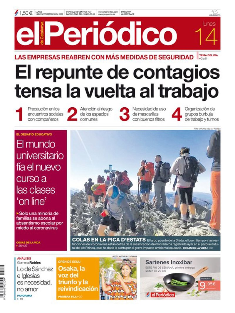 EL PERIÓDICO: "El repunte de contagios tensa la vuelta al trabajo"; "El mundo universitario fía el nuevo curso a las clases 'on lines'"; "Lo de Sánchez e Iglesias es necesidad, no amor".