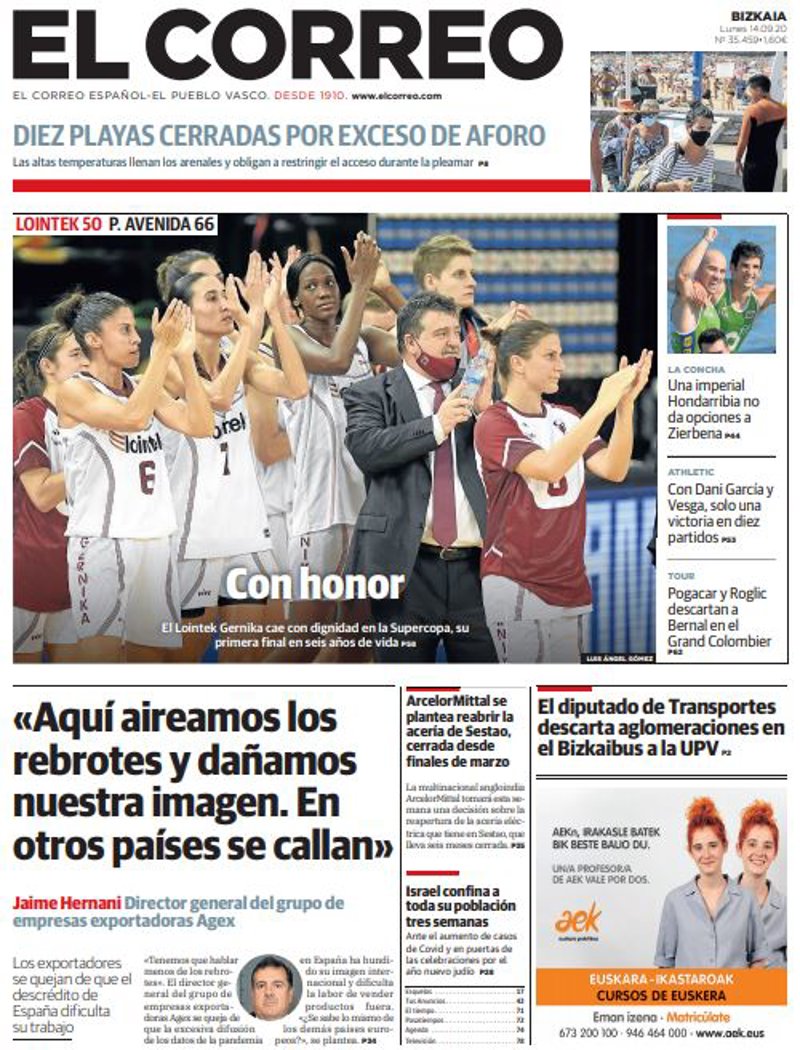 EL CORREO: "Con honor. El Lointek Gernika cae con dignidad en la Supercopa, su primera final en seis años de vida"; ""Aquí aireamos los rebrotes y dañamos nuestra imagen. En otros países se callan""; "El diputado de Transportes descarta aglomeraciones en el Bizkaibus a la UPV"; "ArcelorMittal se plantea reabrir la acería de Sestao, cerrada desde finales de marzo"; "Israel confina a toda su población tres semanas".