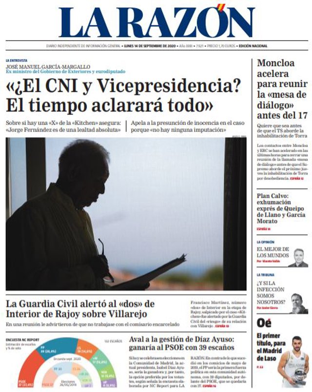 LA RAZÓN: "García-Margallo: ""¿El CNI y Vicepresidencia? El tiempo aclarará todo""; "La Guardia Civil alertó al "dos" de Interior de Rajoy sobre Villarejo"; "Aval a la gestión de Díaz Ayuso: ganaría al PSOE con 39 escaños"; "Moncloa acelera para reunir la "mesa de diálogo" antes del 17"; "Plan Calvo: exhumación exprés de Queipo de Llano y García Morato".