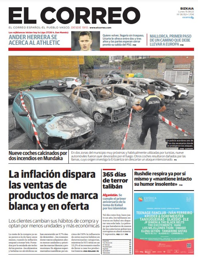 EL CORREO: "Nueve coches calcinados por dos incendios en Mundaka"; "La inflación dispara las ventas de productos de marca blanca y en oferta"; "365 días de terror talibán"; "Rushdie respira ya por sí mismo y "mantiene intacto su humor insolente"".