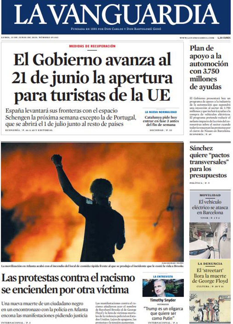 LA VANGUARDIA: "El Gobierno avanza al 21 de junio la apertura para turistas de la UE"; "Las protestas contra el racismo se encienden por otra víctima"; "Plan de apoyo a la automoción con 3.750 millones de ayudas"; "Sánchez quiere "pactos transversales" para los presupuestos".