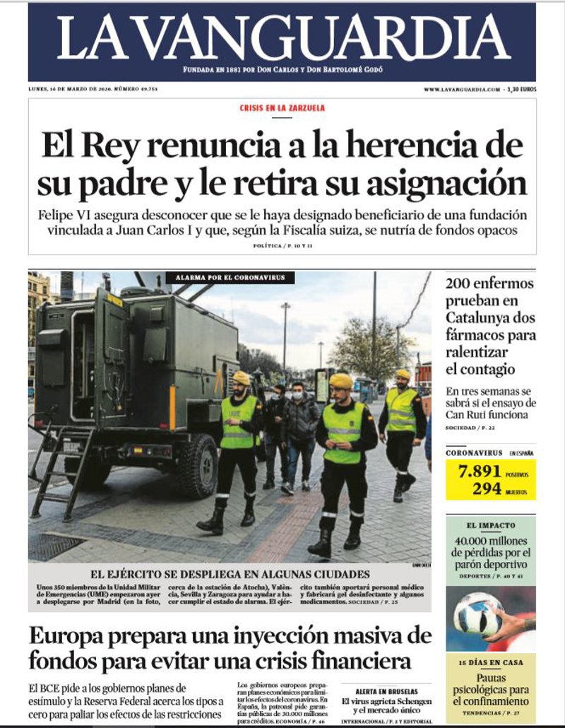 LA VANGUARDIA: "El Rey renuncia a la herencia de su padre y le retira su asignación"; "El Ejército se despliega en algunas ciudades"; "Europa prepara una inyección masiva de fondos para evitar una crisis financiera"; "200 enfermos prueban en Catalunya dos fármacos para ralentizar el contagio".