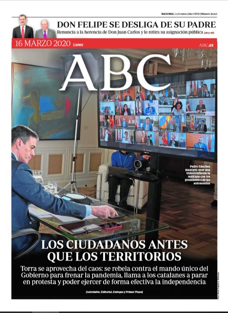 ABC: "Los ciudadanos antes que los territorios. Torra se aprovecha del caos: se rebela contra el mando único del Gobierno para frenar la pandemia, llama a los catalanes a parar en protesta y poder ejercer de forma efectiva la independencia"; "El Rey se desliga de su padre. Renuncia a la herencia de Don Juan Carlos y le retira su asignación pública".
