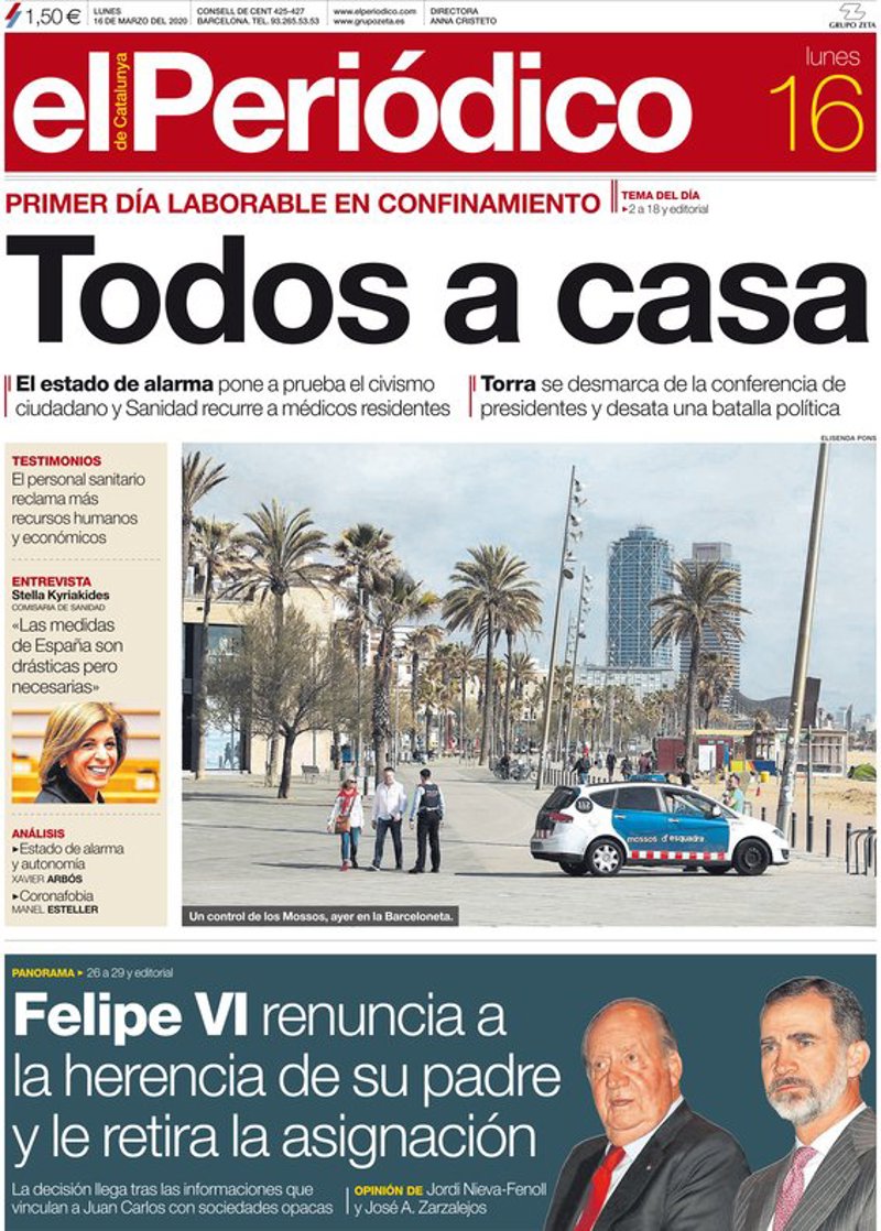 EL PERIÓDICO: "Todos a casa. El estado de alarma pone a prueba el civismo ciudadano y Sanidad recurre a médicos residentes. Torra se desmarca de la conferencia de presidentes y desata una batalla política"; "Felipe VI renuncia a la herencia de su padre y le retira la asignación".