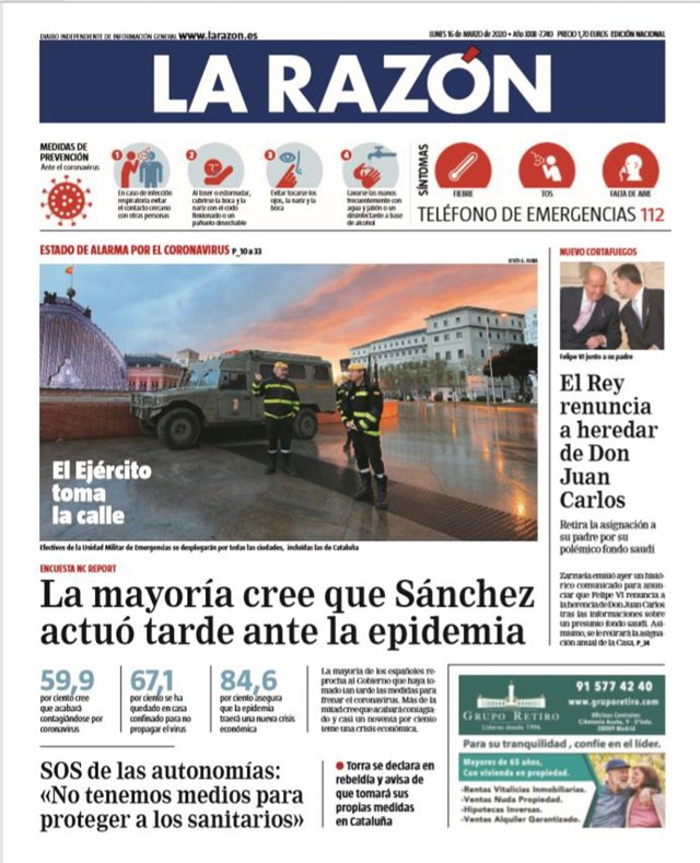 LA RAZÓN: "La mayoría cree que Sánchez actuó tarde ante la epidemia"; "SOS de las autonomías: "No tenemos medios para proteger a los sanitarios". Torra se declara en rebeldía y avisa de que tomará sus propias medidas en Cataluña"; "El Rey renuncia a heredar de Don Juan Carlos".