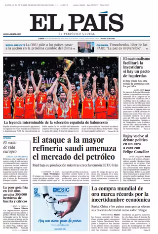 EL PAÍS: "El ataque a la mayor refinería saudí amenaza el mercado del petróleo"; "La leyenda interminable de la selección española de baloncesto"; "El nacionalismo facilitará la investidura si hay un pacto de izquierdas"; "Rajoy vuelve al debate político en un cara a cara con Felipe González".