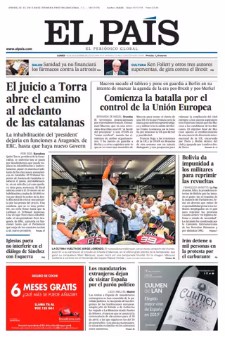 EL PAÍS: "El juicio a Torra abre el camino al adelanto de las catalanas"; "Comienza la batalla por el control de la Unión Europea"; "Bolivia da impunidad a los militares para reprimir las revueltas"; "Iglesias pacta no interferir en el diálogo de Sánchez con Esquerra"; "Irán detiene a mil personas en la protesta por el carburante"; "Los mandatarios extranjeros dejan de visitar España por el parón político".