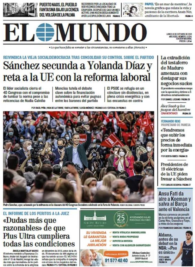 EL MUNDO: "Sánchez secunda a Yolanda Díaz y reta a la UE con la reforma laboral"; "La extradición del testaferro de Maduro amenaza con destapar sus negocios sucios"; "Presidentes de 19 eléctricas de la UE piden frenar a Sánchez"; "'Dudas más que razonables' de que Plus Ultra cumpliera todas las condiciones"; "Ansu Fati da alre a Koeman y salva al Barça ante el Valencia".