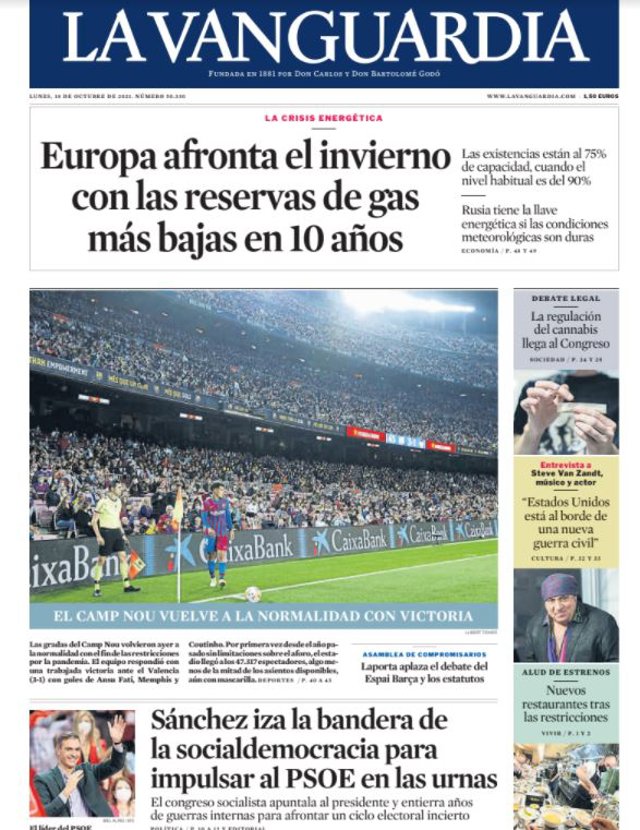 LA VANGUARDIA: "Europa afronta el invierno con las reservas de gas más bajas en 10 años"; "El Camp Nou vuelve a la normalidad con victoria"; "Sánchez iza la bandera de la socialdemocracia para impulsar al PSOE en las urnas".
