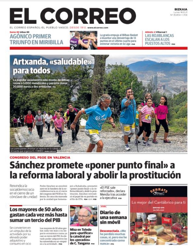 EL CORREO: "Sánchez promete 'poner punto final' a la reforma laboral y abolir la prostitución"; "Artxanda, 'saludable' para todos"; "Los mayores de 50 años gastan cada vez más hasta sumar un tercio del PIB"; "Misa en Toledo para 'purificar' la catedral por los 'pecados' de C. Tangana"; "Diario de una semana sin móvil".