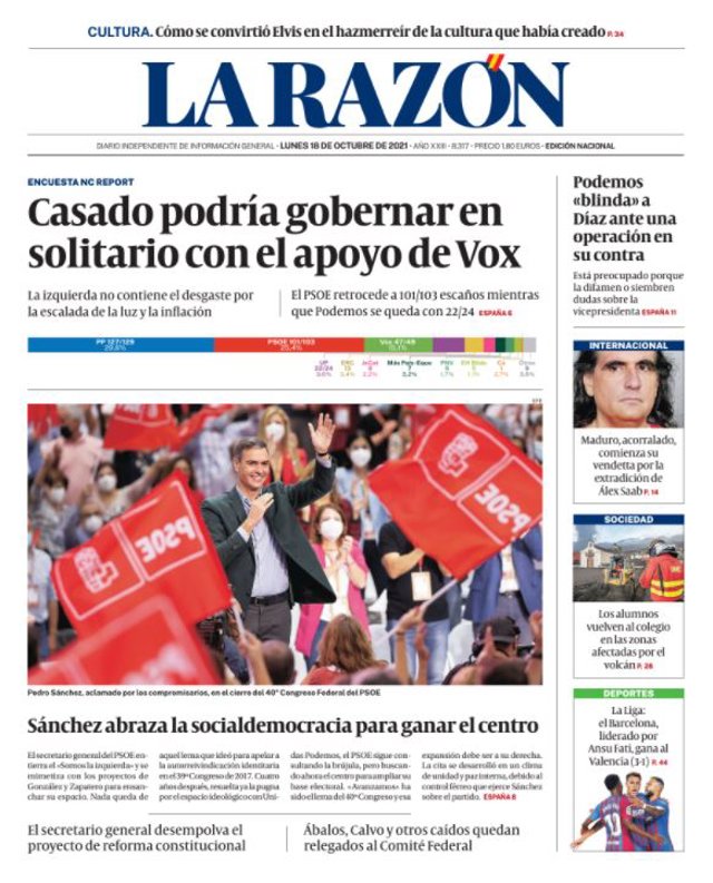 LA RAZÓN: "Casado podría gobernar en solitario con el apoyo de Vox"; "Cómo se convirtió Elvis en el hazmerreír de la cultura que había creado"; "Podemos 'blinda' a Díaz ante una operación en su contra"; "Sánchez abraza la socialdemocracia para ganar el centro"; "Maduro, acorralado, comienza su vende' a por la extradición de Álex Saab"; "Ábalos, Calvo y otros caídos quedan relegados al Comité Federal".