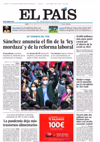EL PAÍS: "Sánchez anuncia el fin de la 'ley mordaza' y de la reforma laboral"; "10.000 millones más para gasto estatal por el ahorro de la covid en 2022"; "La pandemia deja más trastornos alimentarios"; "Maduro rompe con la oposición por la extradición de Alex Saab"; "Novarti pide dos millones por un fármaco para niños con atrofia muscular espinal".