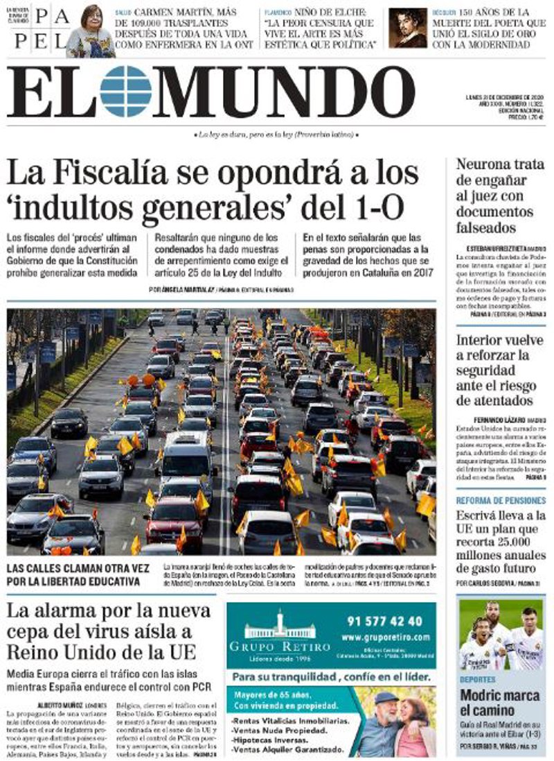 EL MUNDO: "La Fiscalía se opondrá a los 'indultos generales' del 1-O"; "La alarma por la nueva cepa del virus aísla a Reino Unido de la UE"; "Neurona trata de engañar al juez con documentos falseados"; "Interior vuelve a reforzar la seguridad ante el riesgo de contagiados"; "Escrivá lleva a la UE un plan que recorta 25.000 millones anuales de gasto futuro".